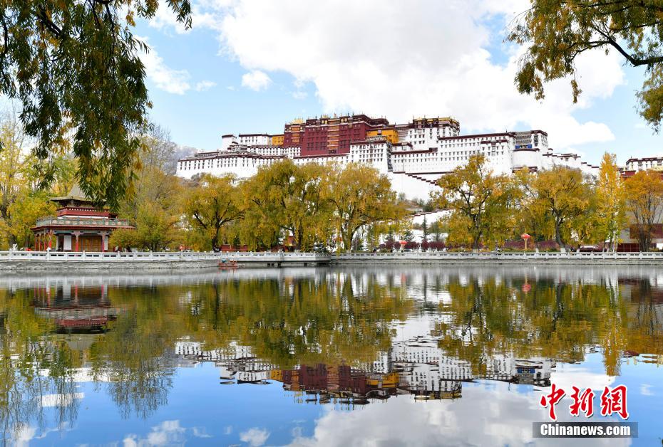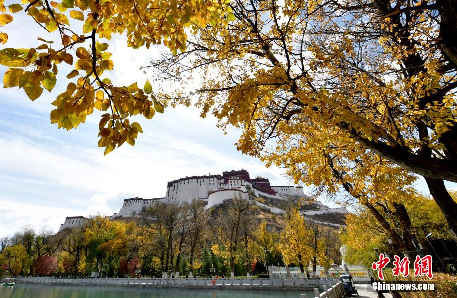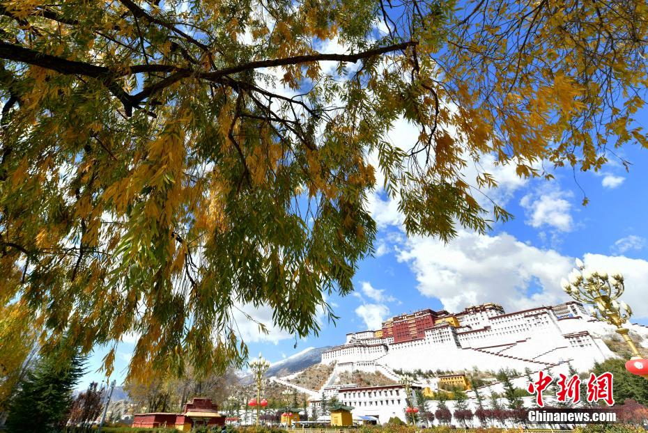 11月6日,位于西藏拉薩的世界文化遺產布達拉宮在周圍樹葉的映襯下色彩斑斕。中新社記者 李林 攝