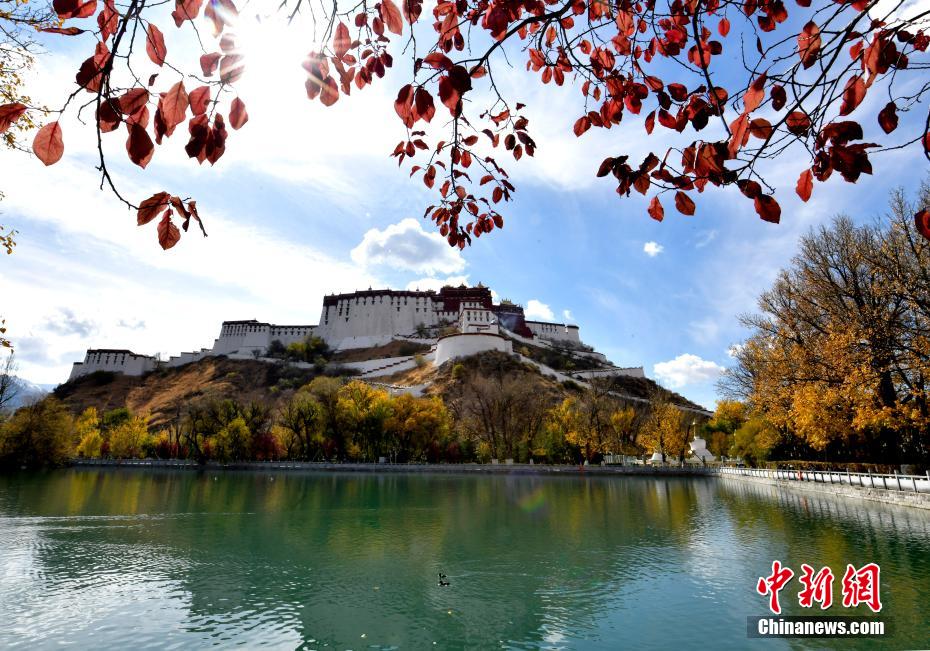 11月6日,位于西藏拉薩的世界文化遺產布達拉宮在周圍紅黃樹葉的映襯下色彩斑斕。中新社記者 李林 攝