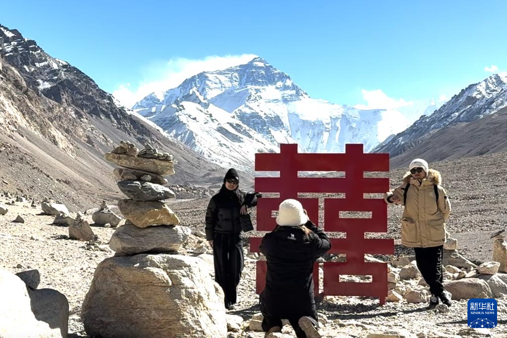 11月20日,游客在珠峰景區的“囍”字前拍照留影。新華社記者 邱星翔 攝