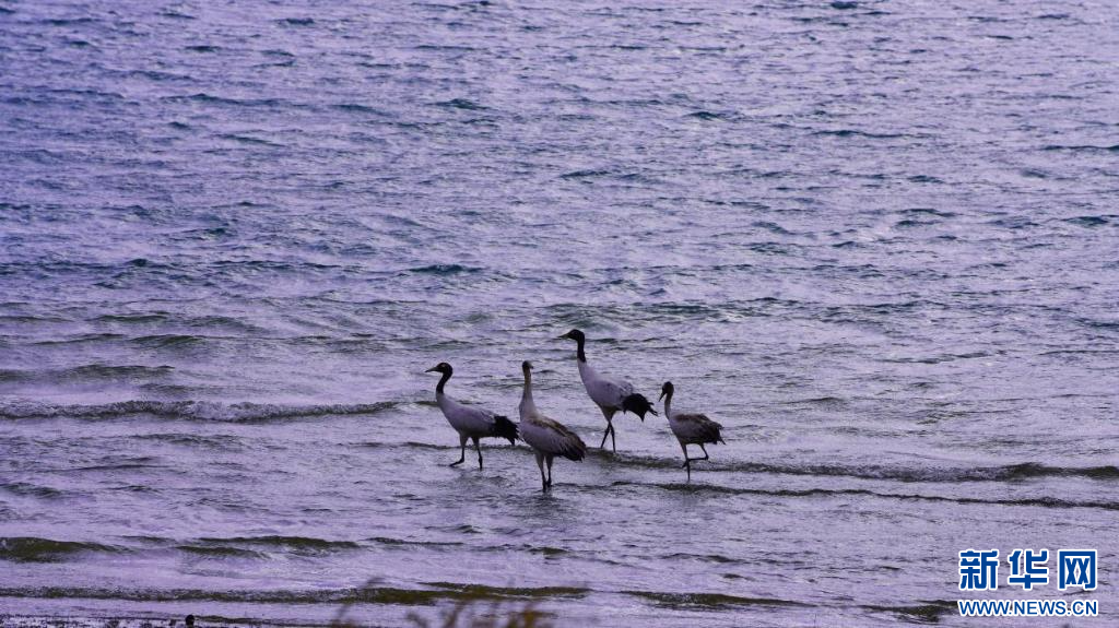 圖為黑頸鶴在湖邊嬉戲(11月24日攝)。新華網發 嘎色攝