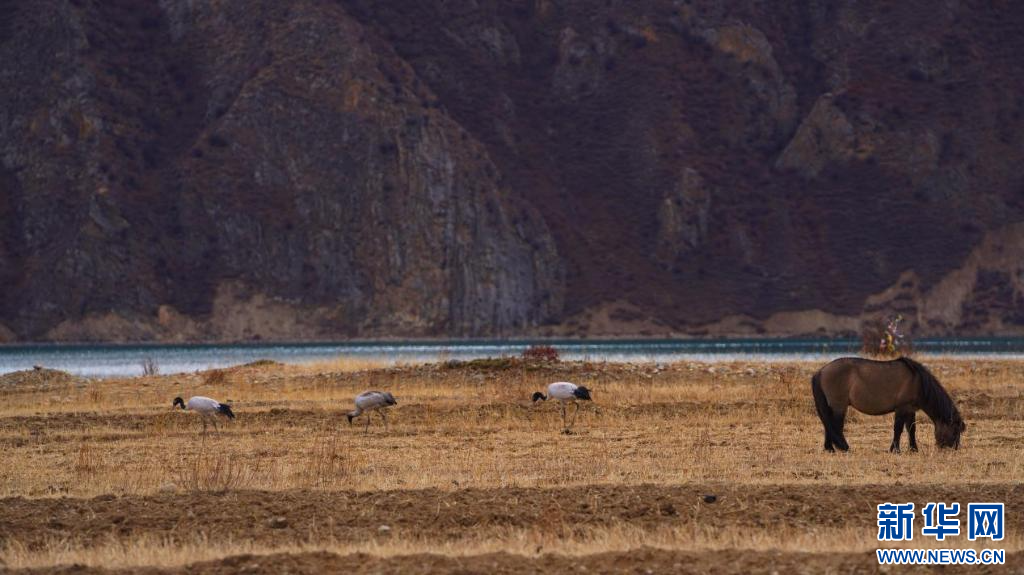 圖為湖邊的黑頸鶴與牦牛(11月24日攝)。新華網發 嘎色攝