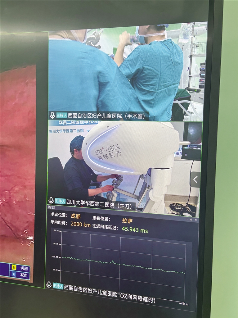 梅玲介紹,此次手術是與四川大學華西第二醫院聯合開展的,由四川大學華西第二醫院的鄭瑩教授團隊主刀,并依托華西的先進技術平臺,通過遠程方式完成手術。手術結束后,鄭瑩教授通過視頻向大家介紹,這場跨越2000公里距離與3000米海拔差異的手術,總共用時1小時45分鐘,網絡延遲僅40毫秒。“此次手術的成功為今后更多優質資源技術送達偏遠地區提供了重要參考,也為提高西藏醫療水平打下了堅實的基礎?!编崿撜f。
