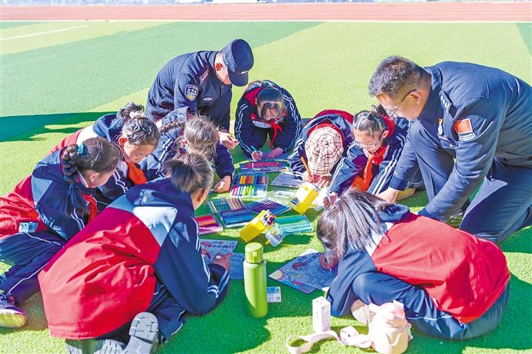 圖為亞東出入境邊防檢查站的民警和學(xué)生一同創(chuàng)作“憲法伴我成長”手抄報。通訊員 李錦輝 攝