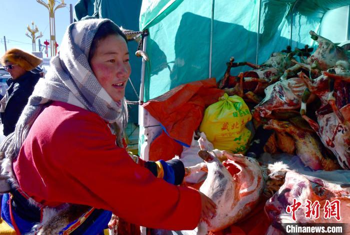 和西藏農(nóng)區(qū)秋季豐收不同,羌塘草原的牧民習(xí)慣在冬季集中宰殺牲畜,這是屬于牧民們的豐收季。牛羊經(jīng)過夏季豐美水草的滋潤,為越冬積蓄了足夠的肉脂。索朗巴珠說,這次家里宰了50只羊,除了在展銷會上售賣,還會留下部分自家食用。
