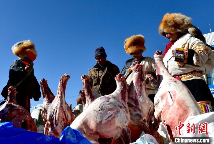 12月6日,西藏自治區(qū)那曲市申扎縣第十八屆畜產(chǎn)品展銷會現(xiàn)場,民眾挑選羊肉。 李林 攝