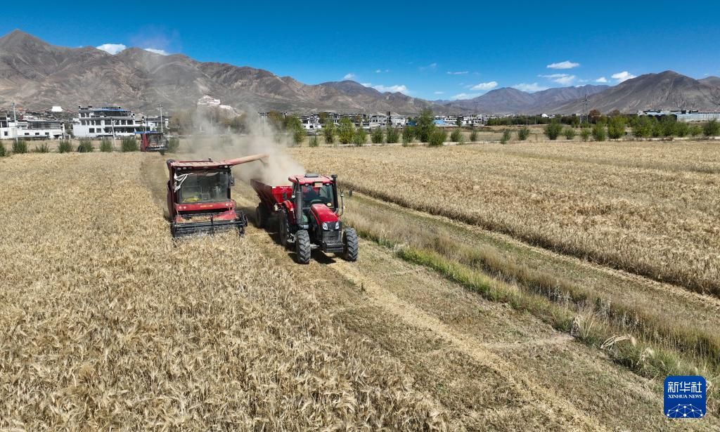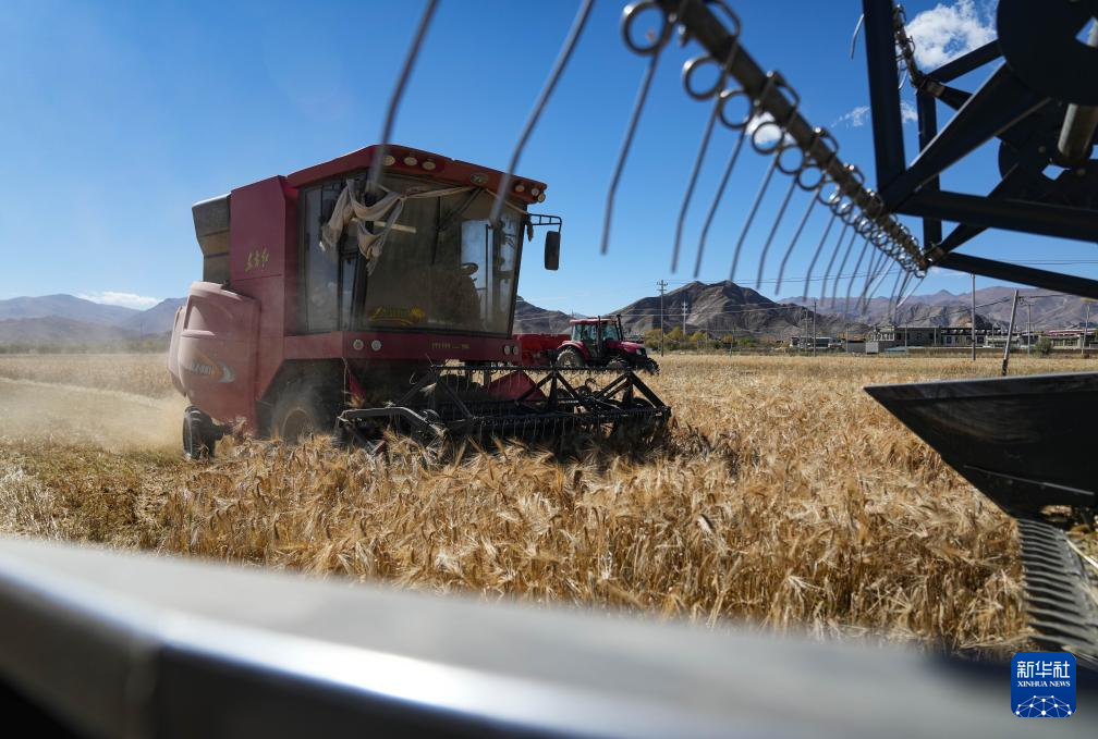 西藏日喀則市江孜縣江熱鄉班覺倫布村農機服務農民專業合作社的社員使用農機收獲青稞(10月16日攝)。新華社記者 晉美多吉 攝