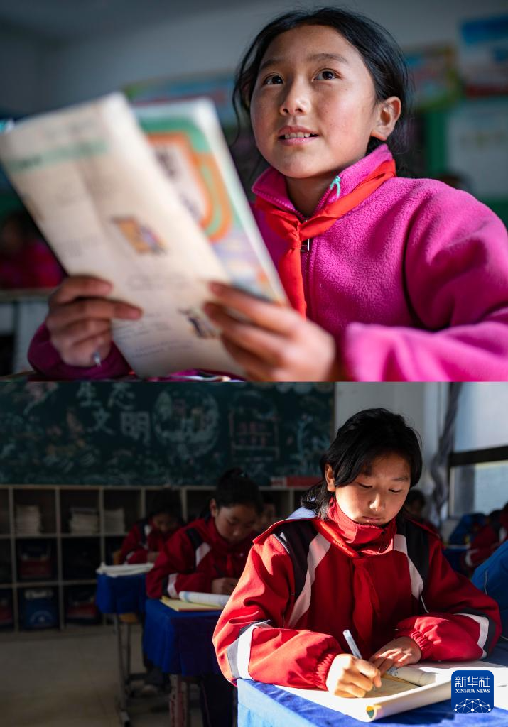 拼版照片:上圖為2021年11月24日,陳塘鎮小學三年級(1)班夏爾巴學生旺姆在讀課文;下圖為2024年12月13日,陳塘鎮小學六年級(1)班夏爾巴學生旺姆在上數學課。