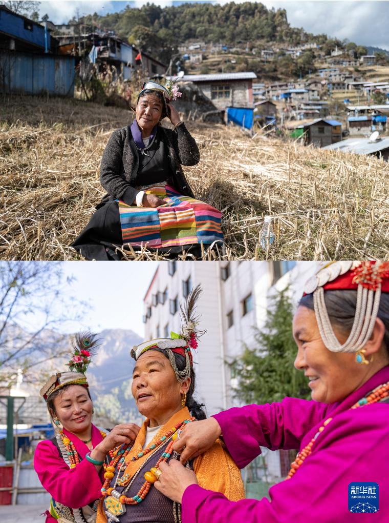 拼版照片:上圖為2021年11月27日,非遺陳塘夏爾巴歌舞代表性傳承人朗嘎在山坡上演唱時調整自己的頭飾;下圖為2024年12月13日,兩位夏爾巴婦女在為非遺陳塘夏爾巴歌舞代表性傳承人穿戴民族服飾。