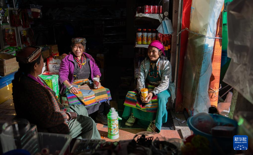 12月13日,三名陳塘鎮夏爾巴婦女在商店里喝奶茶聊天。