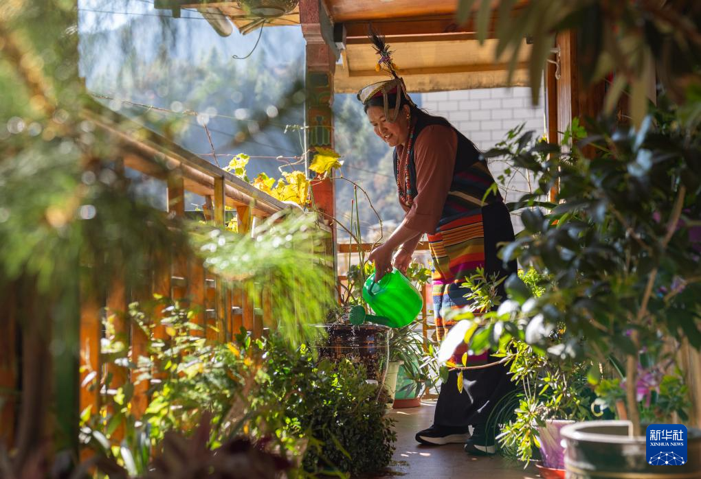 12月13日,陳塘鎮夏爾巴婦女次曲在自家民宿里澆花。