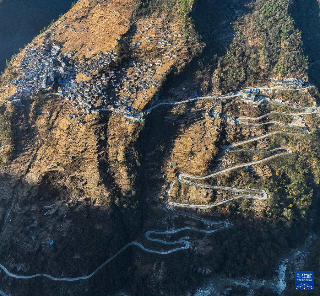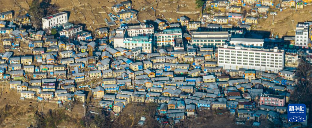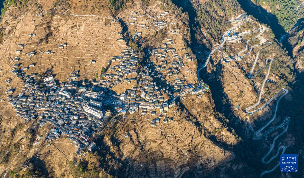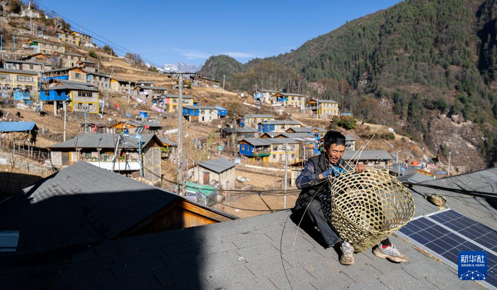 12月13日,陳塘鎮夏爾巴男子在自家屋頂編制竹簍。