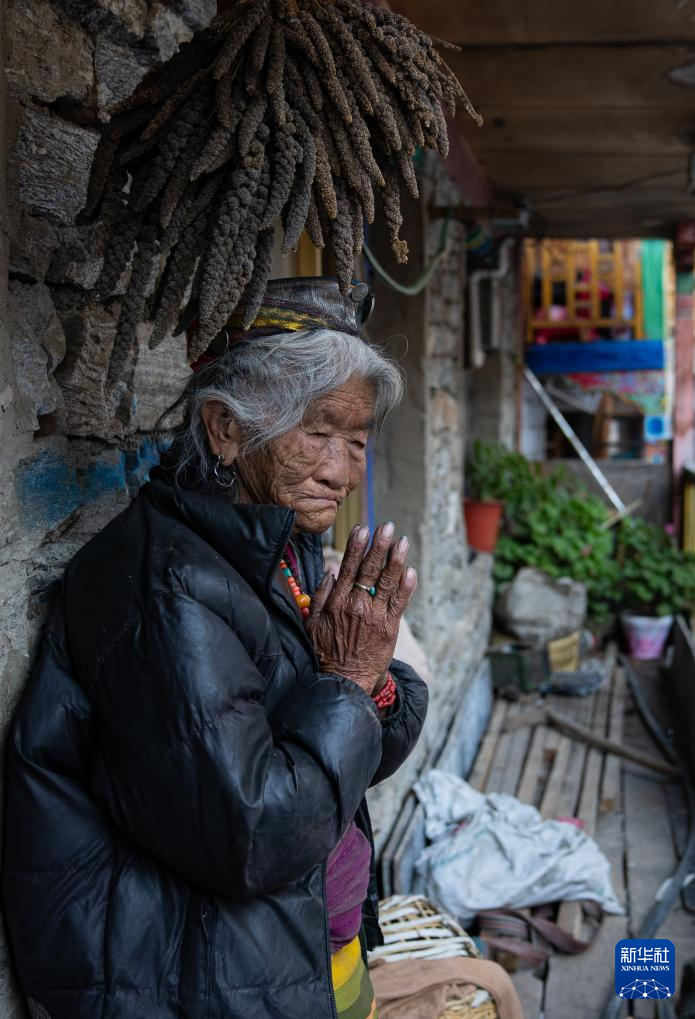 12月13日,一名陳塘鎮夏爾巴老人站在自家陽臺上祈福。