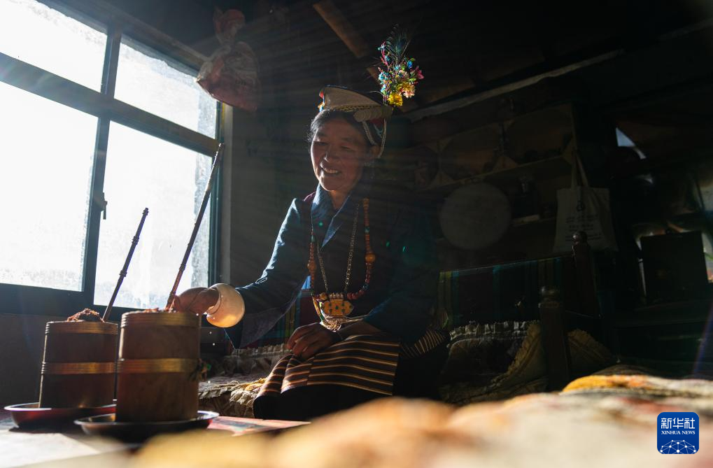 12月13日,陳塘鎮夏爾巴婦女仁增為客人準備飲當地特產雞爪谷酒。