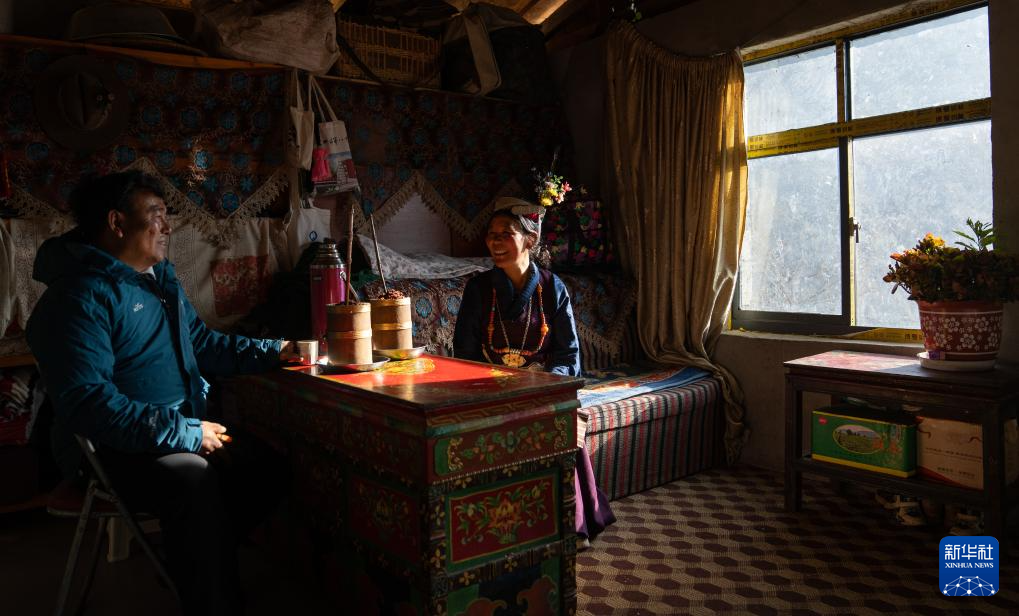 12月13日,陳塘鎮夏爾巴婦女仁增在家里和客人聊天。