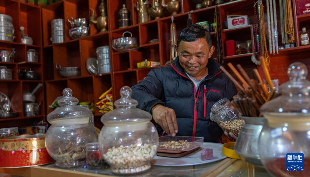 12月13日,一名夏爾巴男子在自家的土特產店里稱量貝母。