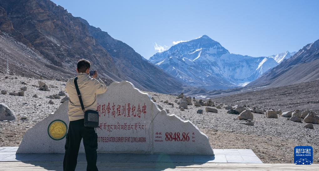 12月14日,游客在珠穆朗瑪峰高程測量紀念碑前拍照留念。新華社記者 丁增尼達 攝
