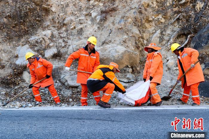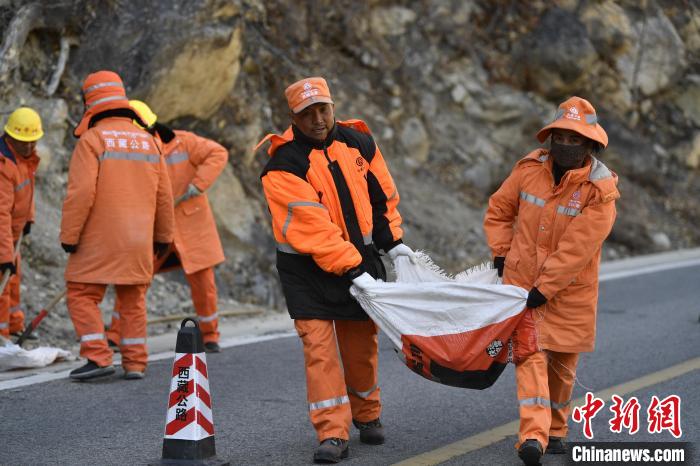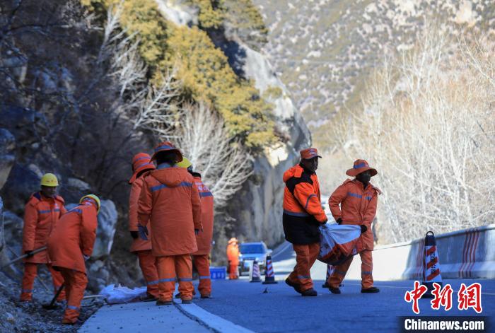 12月16日,西藏自治區林芝公路事業發展和應急保障中心(工布江達養護段)道路養護工人及時清除川藏公路上的落石,保障道路暢通。該養護段擔負著川藏公路沿線工布江達縣路段的養護管理、應急搶險等工作,包括路面修補、清理邊溝、維護交通安全設施等日常養護工作。圖為養護工人在公路上巡護。中新社記者 薛蒂 攝