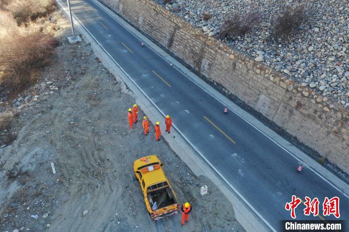 12月16日,西藏自治區林芝公路事業發展和應急保障中心(工布江達養護段)道路養護工人及時清除川藏公路上的落石,保障道路暢通。該養護段擔負著川藏公路沿線工布江達縣路段的養護管理、應急搶險等工作,包括路面修補、清理邊溝、維護交通安全設施等日常養護工作。圖為養護工人在公路上巡護。(無人機照片)中新社記者 貢嘎來松 攝