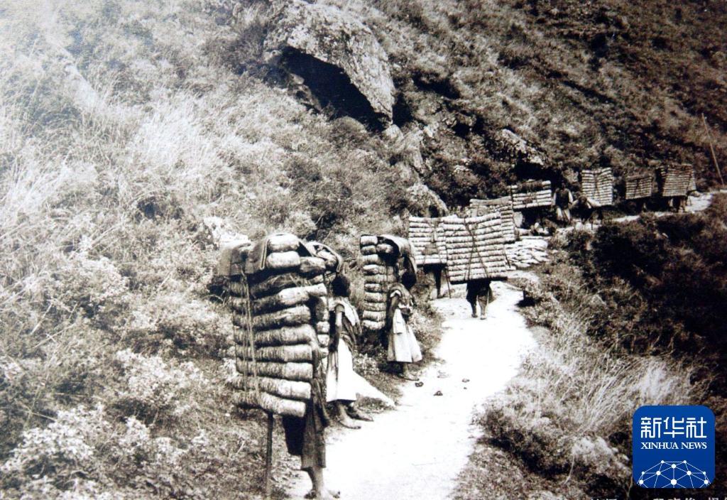 1903年茶馬古道上,背夫從四川瀘定背茶前往青藏高原。新華社發