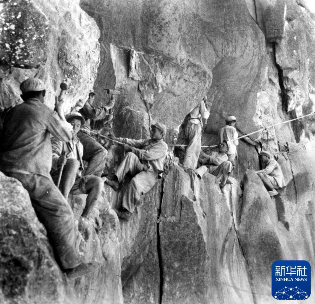 這是筑路戰士在懸崖絕壁上修建川藏公路。新華社發