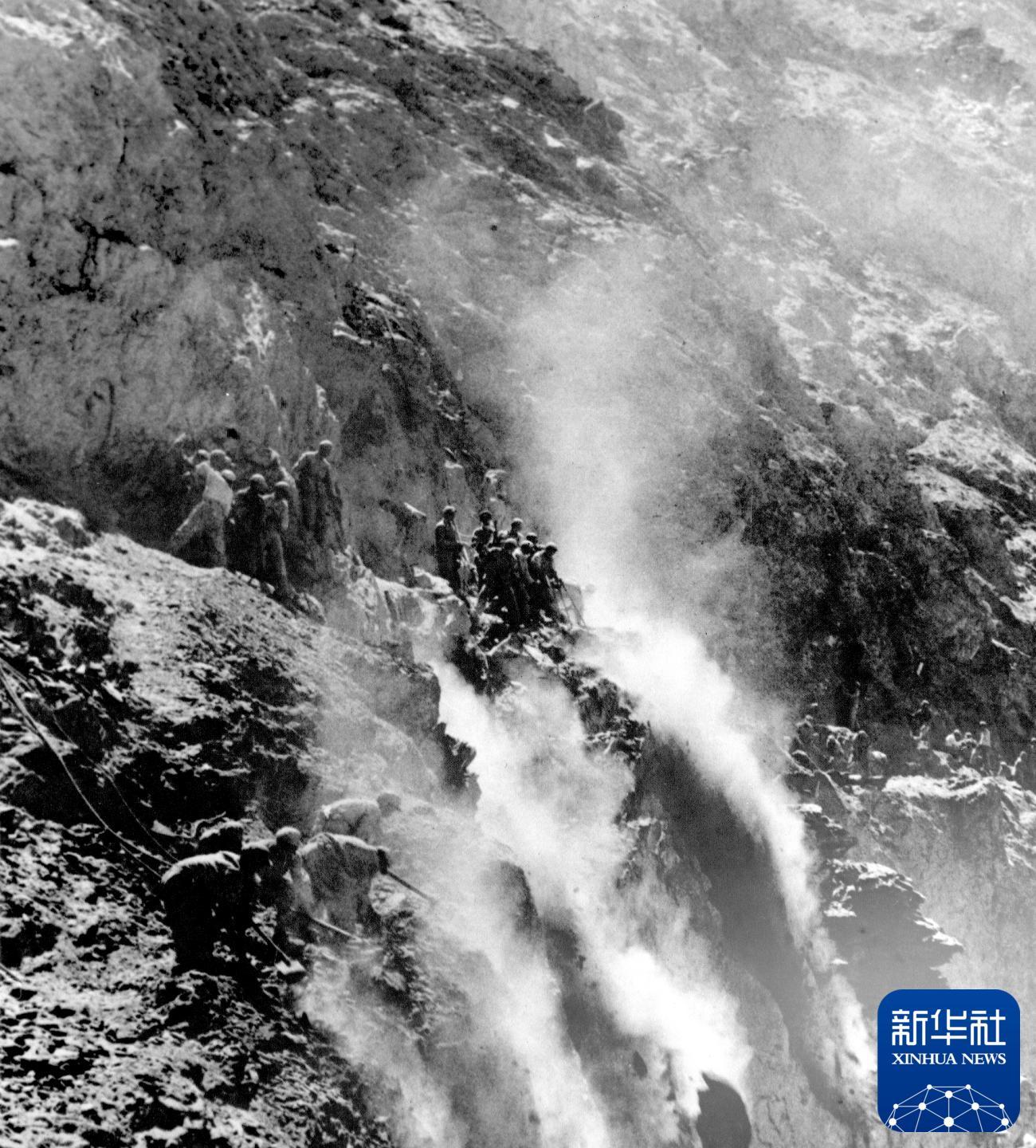 筑路戰士在怒江兩岸的懸崖陡壁上辟山筑路。新華社發