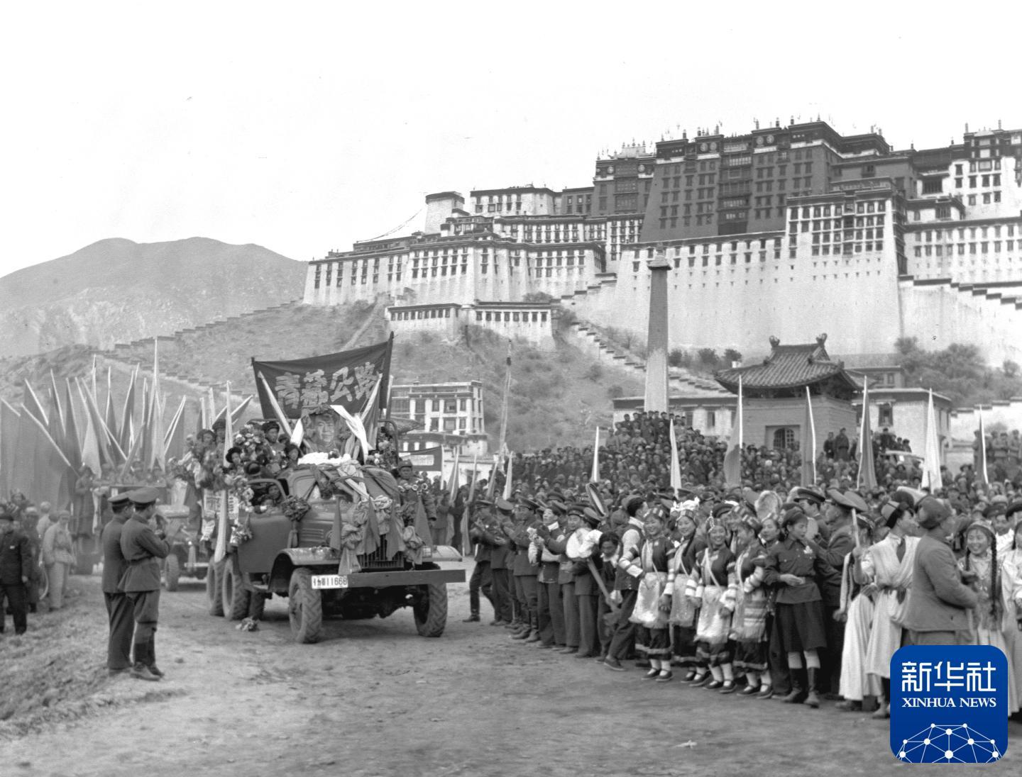 1954年12月25日,川藏公路、青藏公路同時正式通車。這是通車儀式在西藏拉薩舉行。新華社發