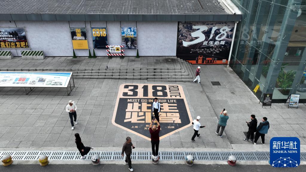 2024年10月27日,游客在雅康高速天全服務區地標圖案前拍照(無人機照片)。新華社記者 胥冰潔 攝