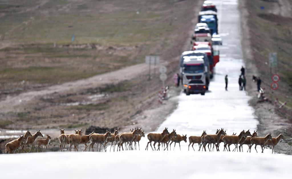 一群藏羚羊通過(guò)青藏公路前往青海三江源地區(qū)(2023年7月28日攝)。新華社記者 張宏祥 攝