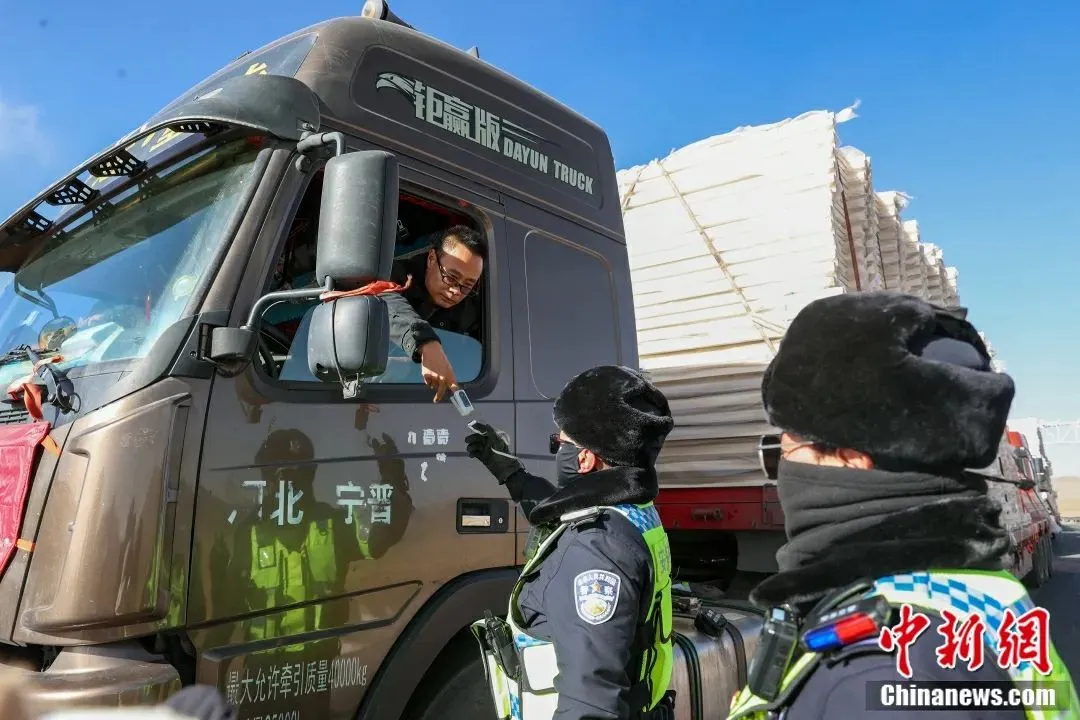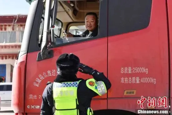 圖為交警對(duì)貨車(chē)檢查后敬禮放行。中新社記者 貢嘎來(lái)松 攝