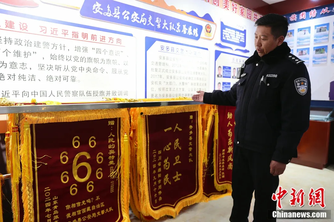 圖為安多縣交警向記者展示多年來(lái)獲贈(zèng)的部分錦旗。中新社記者 薛蒂 攝