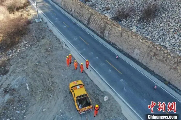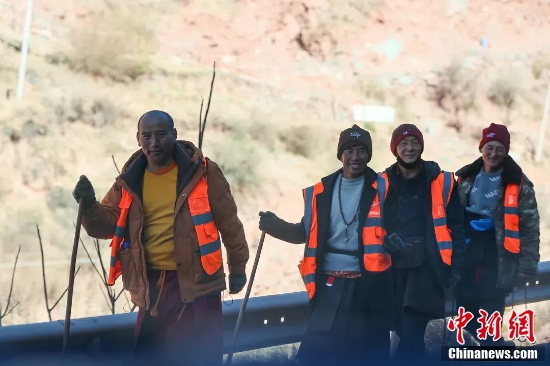 圖為巴桑次仁和同事們?cè)诠飞涎沧o(hù)。中新社記者 薛蒂 攝