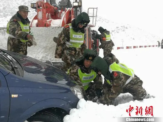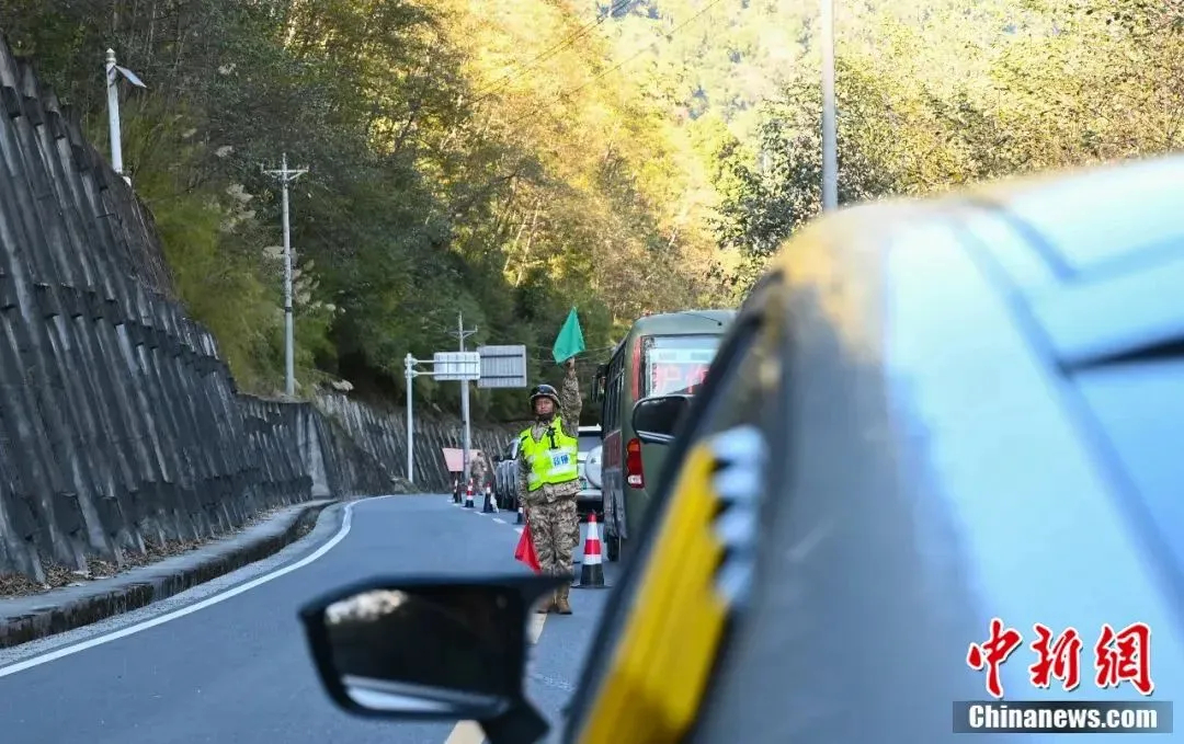 圖為管護(hù)完畢后,武警官兵放行等待車(chē)輛。中新社記者 趙朗 攝