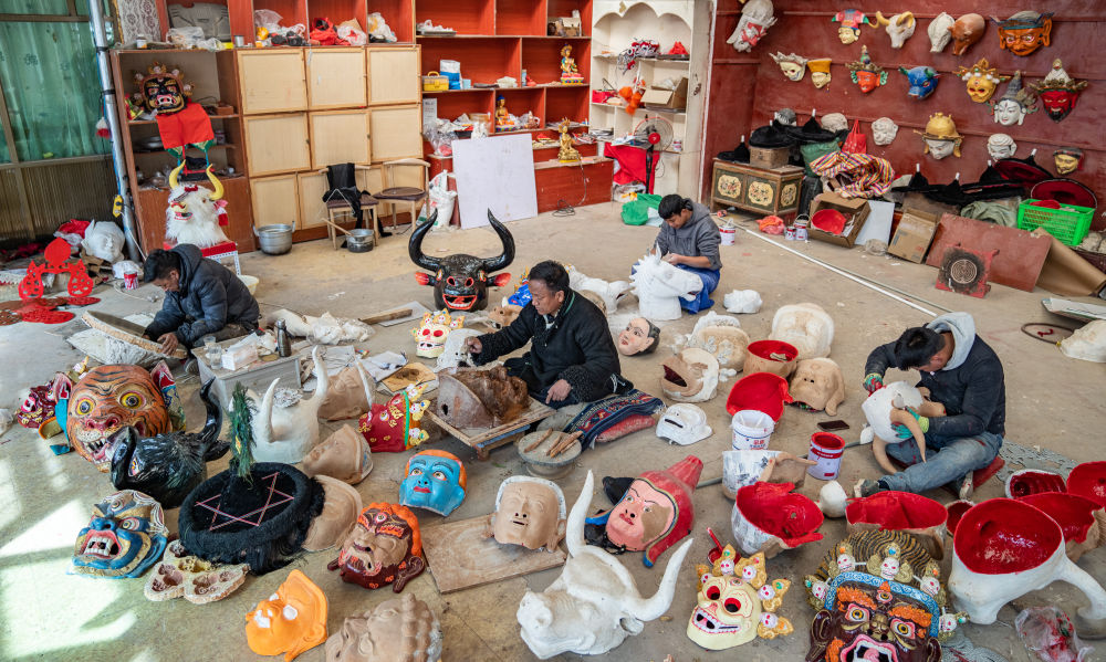 拉薩布制面具制作技藝西藏自治區級非遺傳承人西洛(中)和同事一同制作西藏傳統面具。