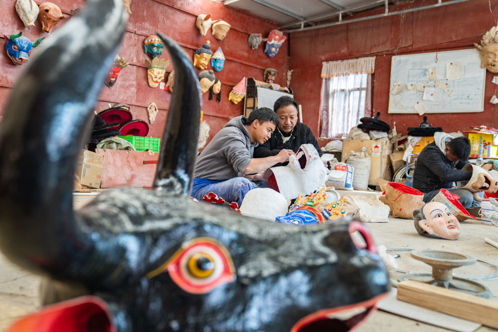 拉薩達孜區雪鄉民間傳統手工藝農民專業合作社的面具制作工匠制作傳統面具。