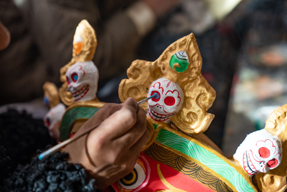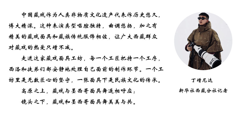 20世紀90年代,西洛就跟隨師父在西藏各地制作藏戲面具。一開始,他認為面具制作只是一門糊口的手藝。但其實面具在藏戲表演中十分重要,演員表演藏戲時無需化妝,主要是戴面具表演。整體上看,藏戲分為白面具戲和藍面具戲。在同一臺藏戲中,又會出現紅、白、藍、黑、黃等不同顏色的面具,代表不同身份。