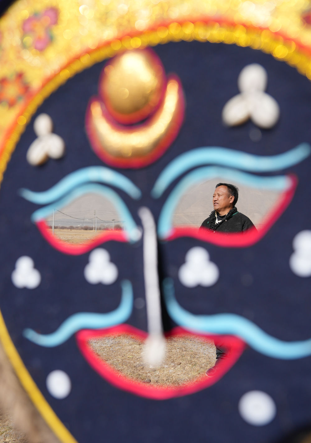 拉薩布制面具制作技藝西藏自治區級非遺傳承人西洛在合作社門前的空地上和同事一起檢查做好的西藏傳統面具。