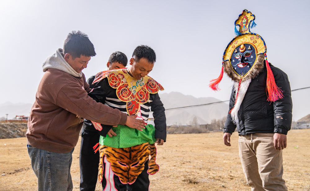 拉薩達孜區雪鄉民間傳統手工藝農民專業合作社的工匠在合作社門前的空地上佩戴檢查做好的西藏傳統面具。