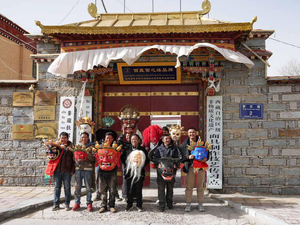拉薩達孜區雪鄉民間傳統手工藝農民專業合作社的面具制作工匠們在合作社門口合影。