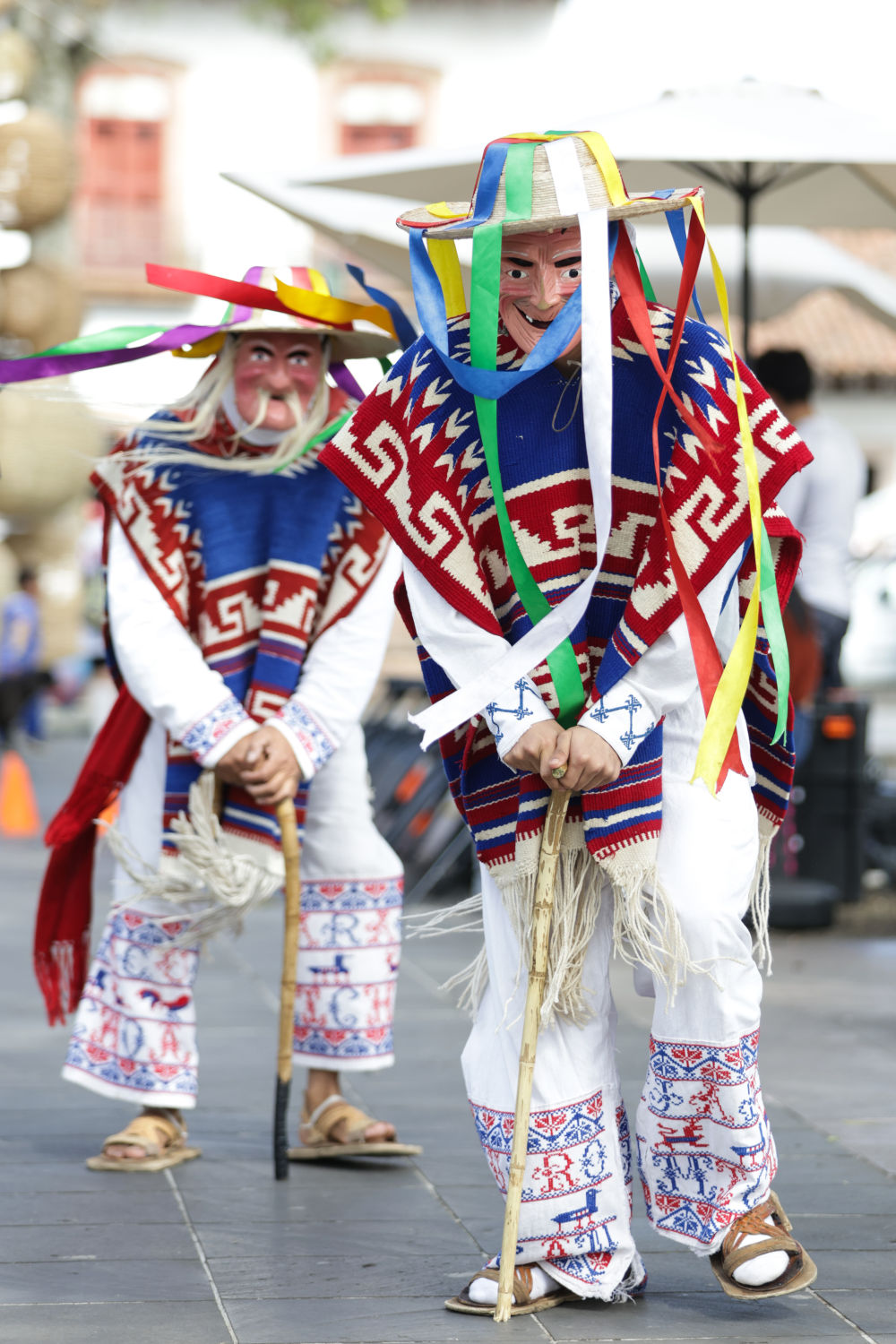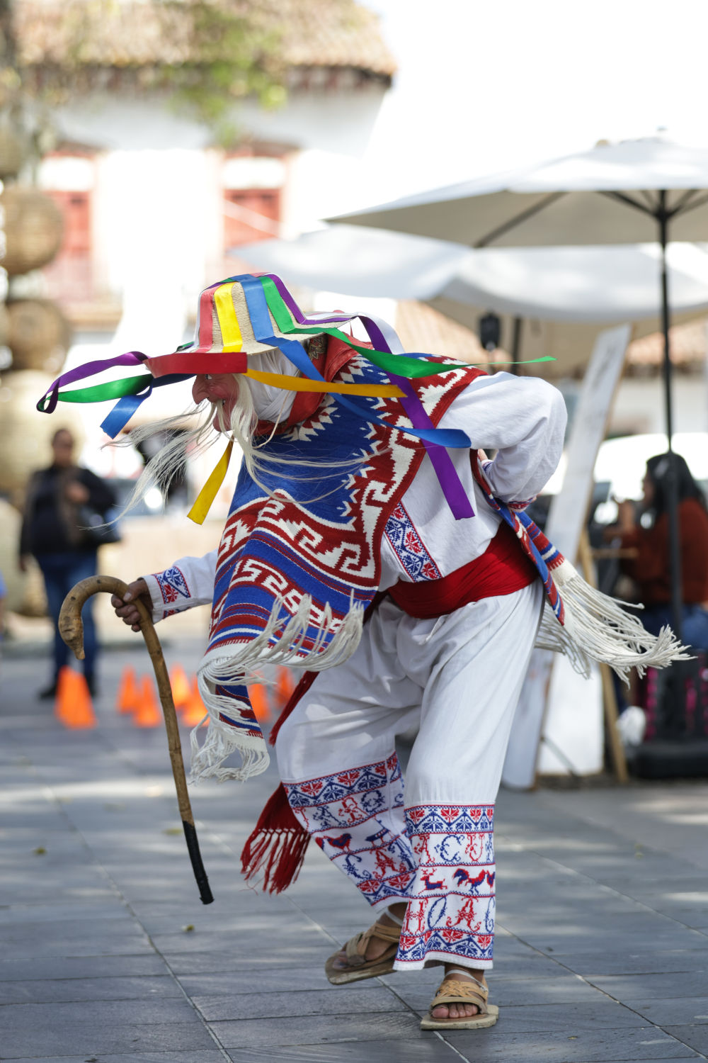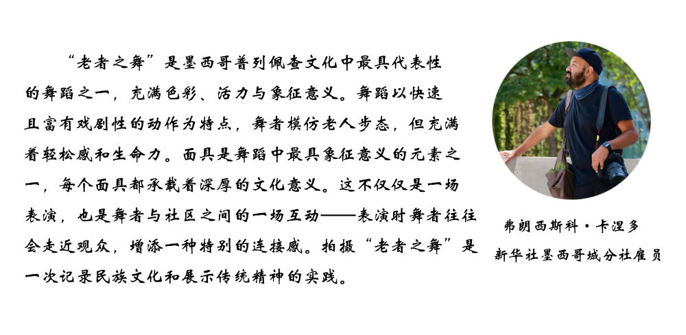 面具制作在墨西哥也有著悠久的歷史,有各式各樣的面具用于各種舞蹈和慶典。舞者表演“老者之舞”時往往配戴著略顯夸張的面具,面具通常帶有皺紋、胡須和微笑的表情,借以塑造一種看似滑稽、幽默卻充滿智慧的形象。除了老人面具,舞者表演時還會穿著傳統的普列佩查民族服飾,包括刺繡彩色披肩、白色農民風格的長衫和編織草帽,整體造型鮮艷、喜慶。舞蹈表演時舞者會模仿老人的步態,以滑稽的方式彎腰駝背,手持拐杖或木棍,搖搖晃晃地邁步,同時做出靈活的跳躍和旋轉動作,展現一種出人意料的活力與生命力。
