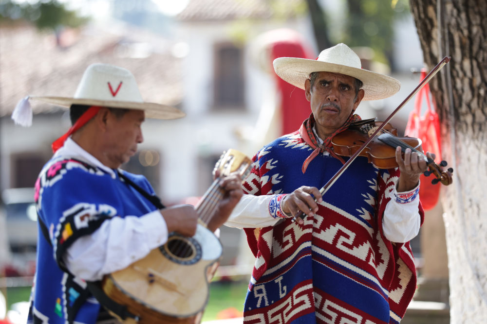 一名舞者在墨西哥米卻肯州的帕茨夸羅,藝術家演奏小提琴和吉他為“老者之舞”表演伴奏。