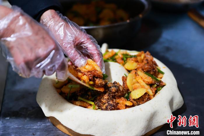 肉質鮮嫩的高原牦牛肉被炭火烤至表面金黃、油汁溢出,輔以外焦里糯的高原土豆、撒上蔥花和蒜末增香,用面皮蓋上“被子”,一道色香味俱全的牦牛肉蓋被便完成了。將其切塊并蘸上川味辣椒,一口下去,綿密與脆爽在舌尖混合,蔥蒜與辣椒唇齒留香。