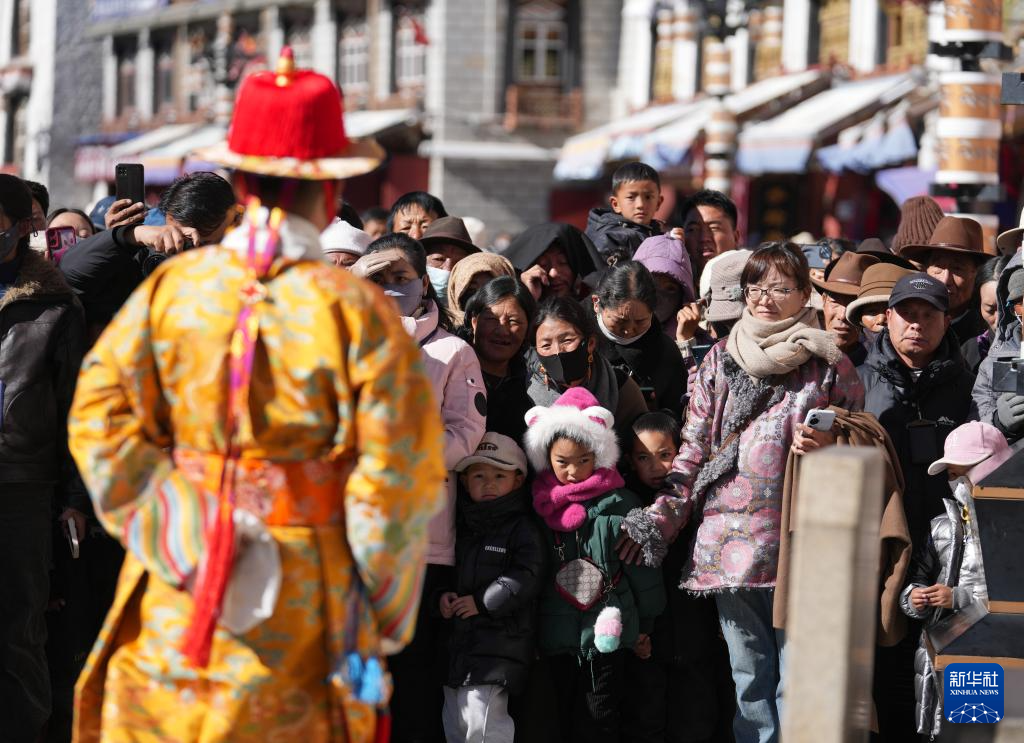 作為拉薩市文化和旅游局主辦的“繁飾自然·衣彩拉薩——拉薩新年服飾秀”群眾文化活動的一部分,1月3日,穿著傳統藏裝的模特巡游在拉薩八廓街。
