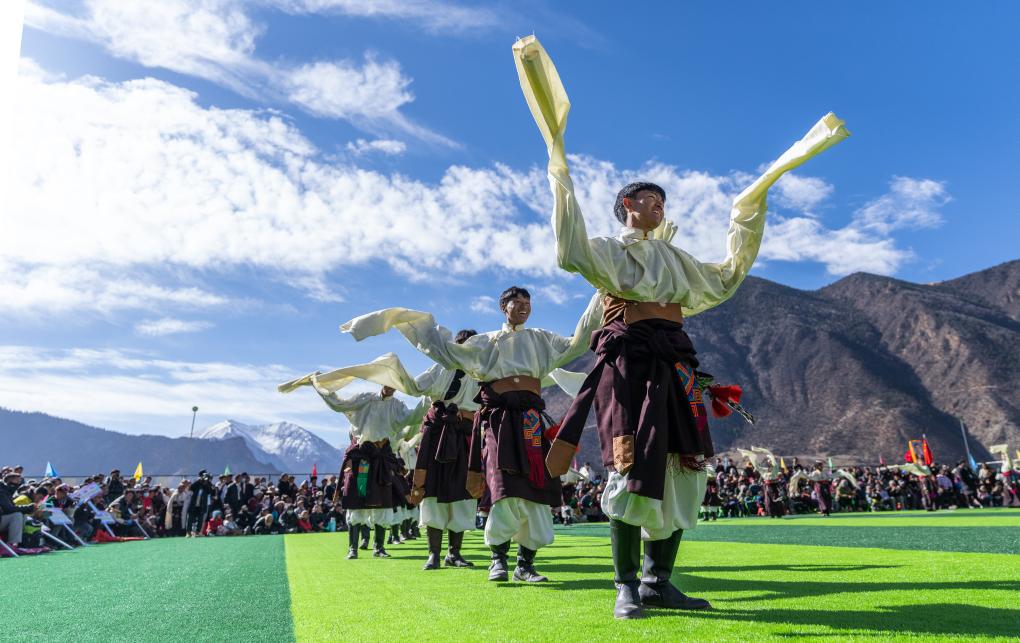 在馬利鎮“云中球場”,當地群眾在球賽開幕式上表演舞蹈(1月2日攝)。新華社記者 丁增尼達 攝
