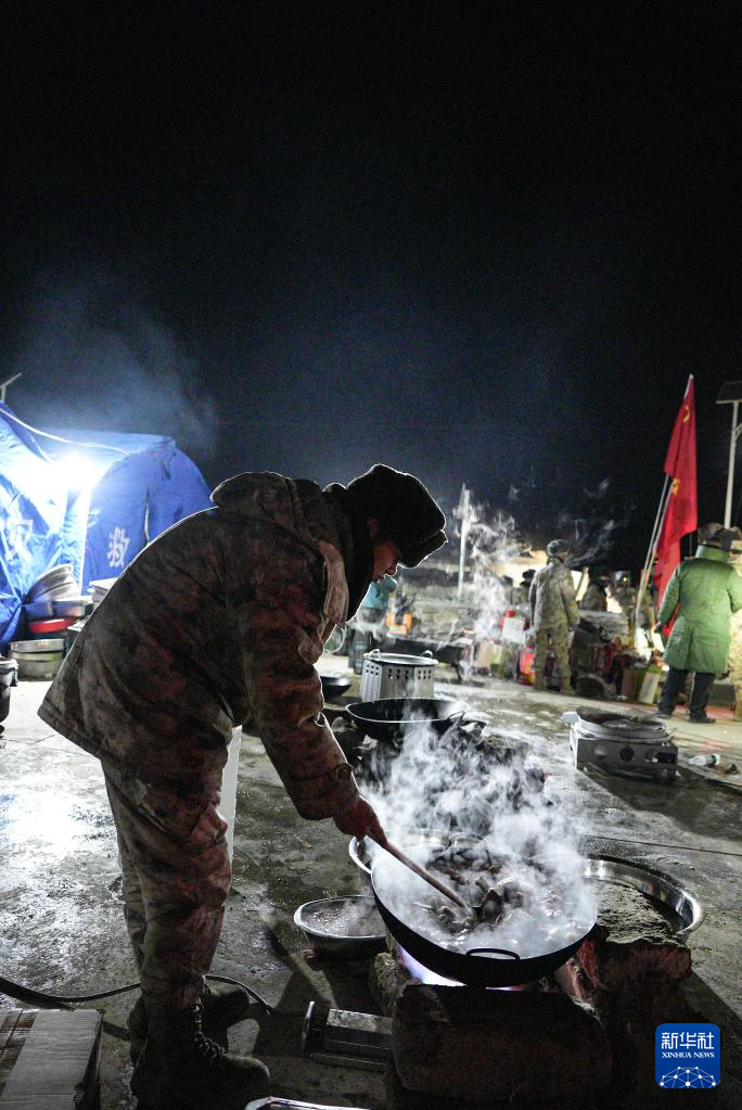 1月7日,在定日縣古榮村集中安置點,解放軍為受災群眾做飯。新華社記者 晉美多吉 攝
