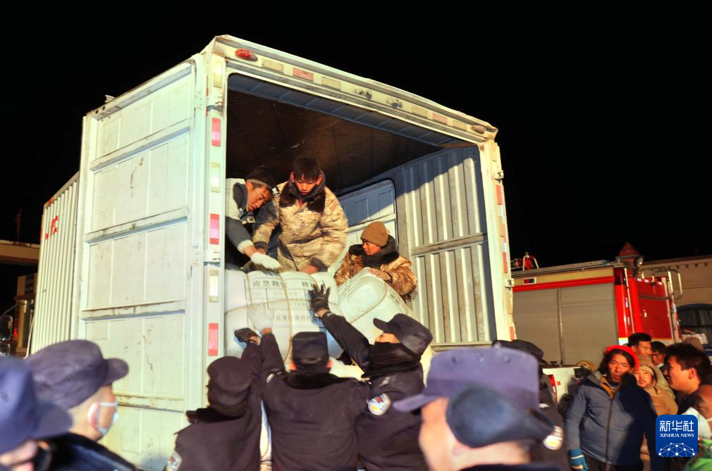 1月7日,救援人員在定日縣措果鄉裝運救災物資。新華社記者 姜帆 攝