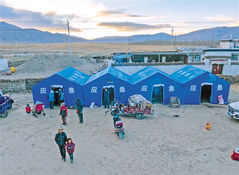 圖為1月7日,在拉孜縣曲下鎮(zhèn)土林村,受災群眾搬入應急帳篷(無人機照片)。新華社記者 姜帆 攝