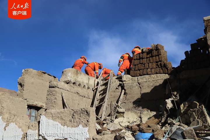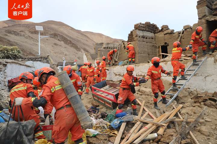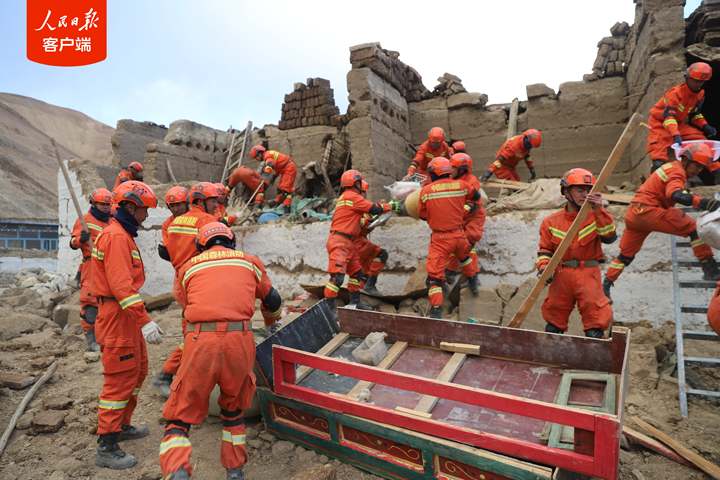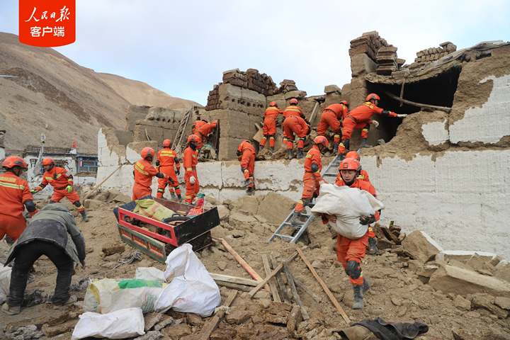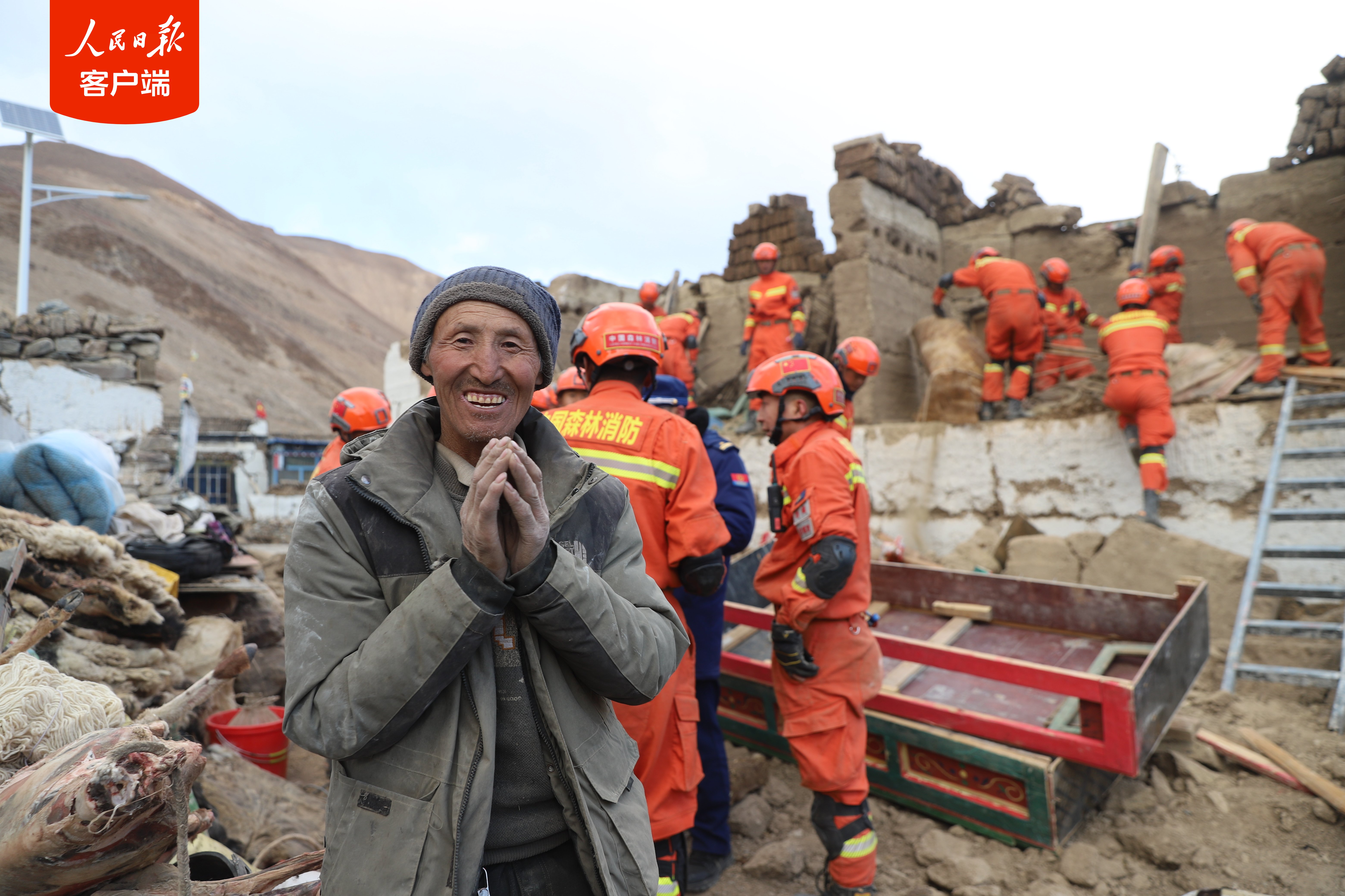 1月7日,西藏日喀則市定日縣發生6.8級地震后,西藏森林消防總隊指戰員第一時間趕赴受災嚴重的措果鄉野江村展開救援。救援人員把埋在廢墟里的牦牛和生活物資搶救出來后,村民雙手合十,真誠感謝黨和國家,感謝救援人員。