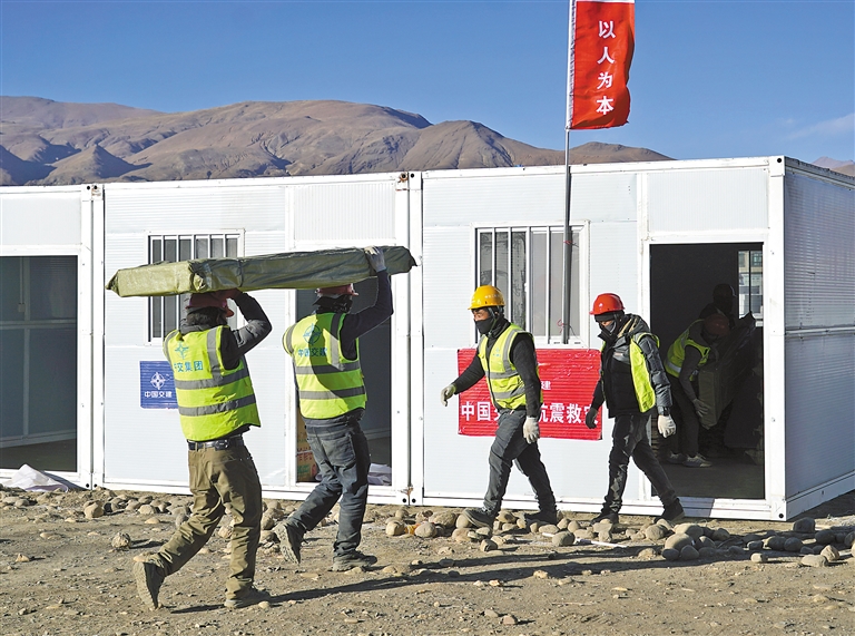 圖為1月10日,中交集團(tuán)二航局二公司工作人員在拉孜縣為受災(zāi)群眾組裝活動板房。記者 薛瑩 王香香 索朗群培 攝