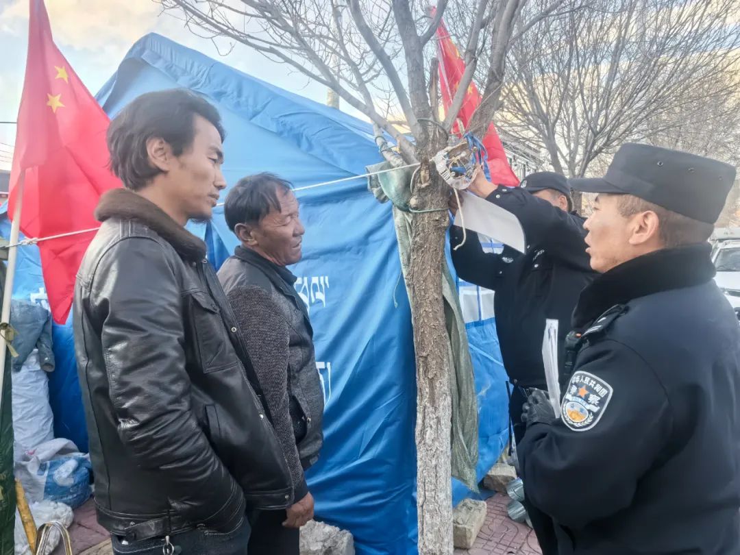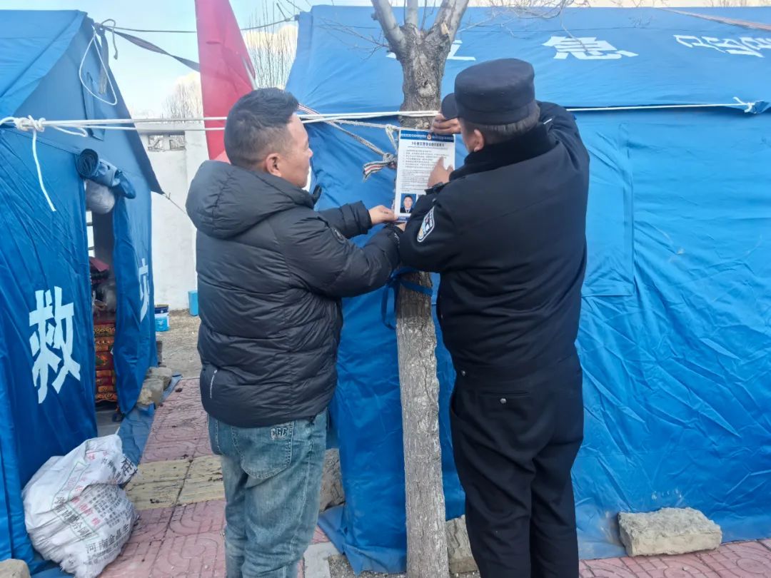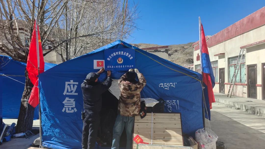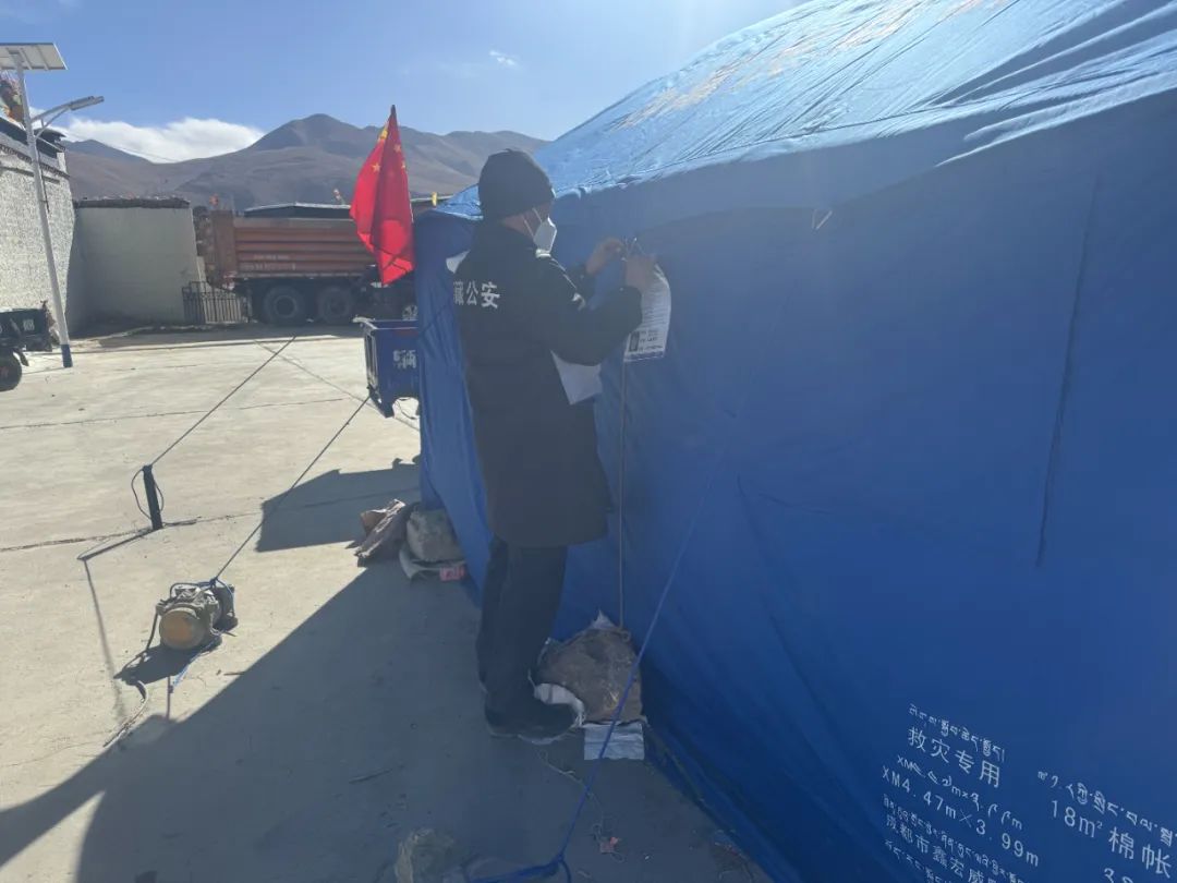 災情如令,責任重于泰山。在這場爭分奪秒與時間賽跑的抗震救災戰斗中,拉孜公安始終堅定地與群眾并肩同行,以“伴隨式”守護的帳篷警務室,為受災群眾筑牢安全防線。一頂頂 “帳篷警務室” 以迅雷不及掩耳之勢搭建完成,恰似一座座堅固的堡壘;一面面鮮艷的黨旗在廢墟之上獵獵作響,傲然飄揚,它們共同構成了守護受災群眾生命財產安全的鋼鐵長城,成為抗震救災戰場上一道令人動容的亮麗風景線 。