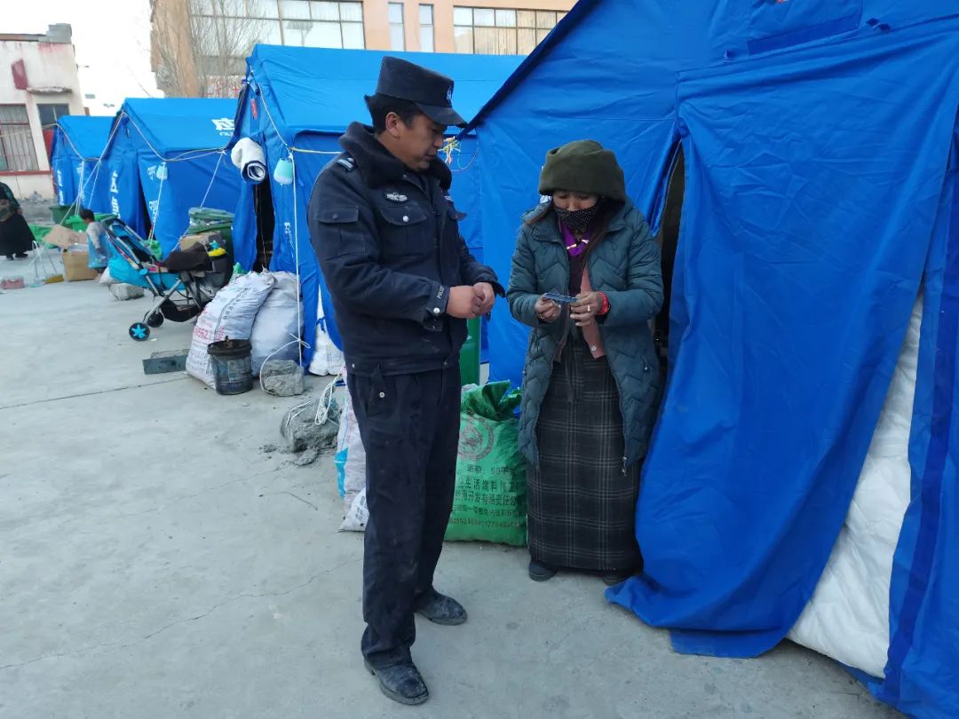 天還未亮,民輔警已投身救災一線,忙碌于清點救援物資。緊接著,他們步履不停,深入每一村每一戶,細致收集家庭基本信息,評估受災程度及房屋損毀情況,并逐一核實帳篷內供暖、供電等基本生活需求的落實情況。走訪之際,一張張警民聯系卡被張貼于顯眼位置,親手遞到群眾手中,旨在迅速響應群眾訴求,引導合理表達困難與期望。同時,他們對孤寡老人、殘疾人、精神病患者、流浪人員及重癥病患等特殊群體給予了特別關注,積極協調資源,切實解決其實際難題,構建起一座堅實的警民溝通橋梁。為確保轄區安寧,民輔警們進一步加大了社會面巡邏力度,細致排查潛在矛盾糾紛,全力預防偷盜、詐騙、搶劫等違法犯罪行為,當得知群眾財物被困且面臨損毀,他們不顧危險,憑專業技能穿梭廢墟,爭分奪秒搶救財物,全力守護群眾財產安全。在這過程中,民輔警不辭辛勞,反復穿梭于村落之間,確保救助工作覆蓋到每一個角落,每一個人,無論多少次往返,只為確?!安宦┮粦簦宦湟蝗恕??!熬焱?,你們辛苦了!”“感謝你們的付出,為你們點贊加油!我們一起努力戰勝災情!”……群眾一句句暖心的話語,化作源源不斷的動力,讓民輔警們更加堅定了抗震救災必勝的信心 。